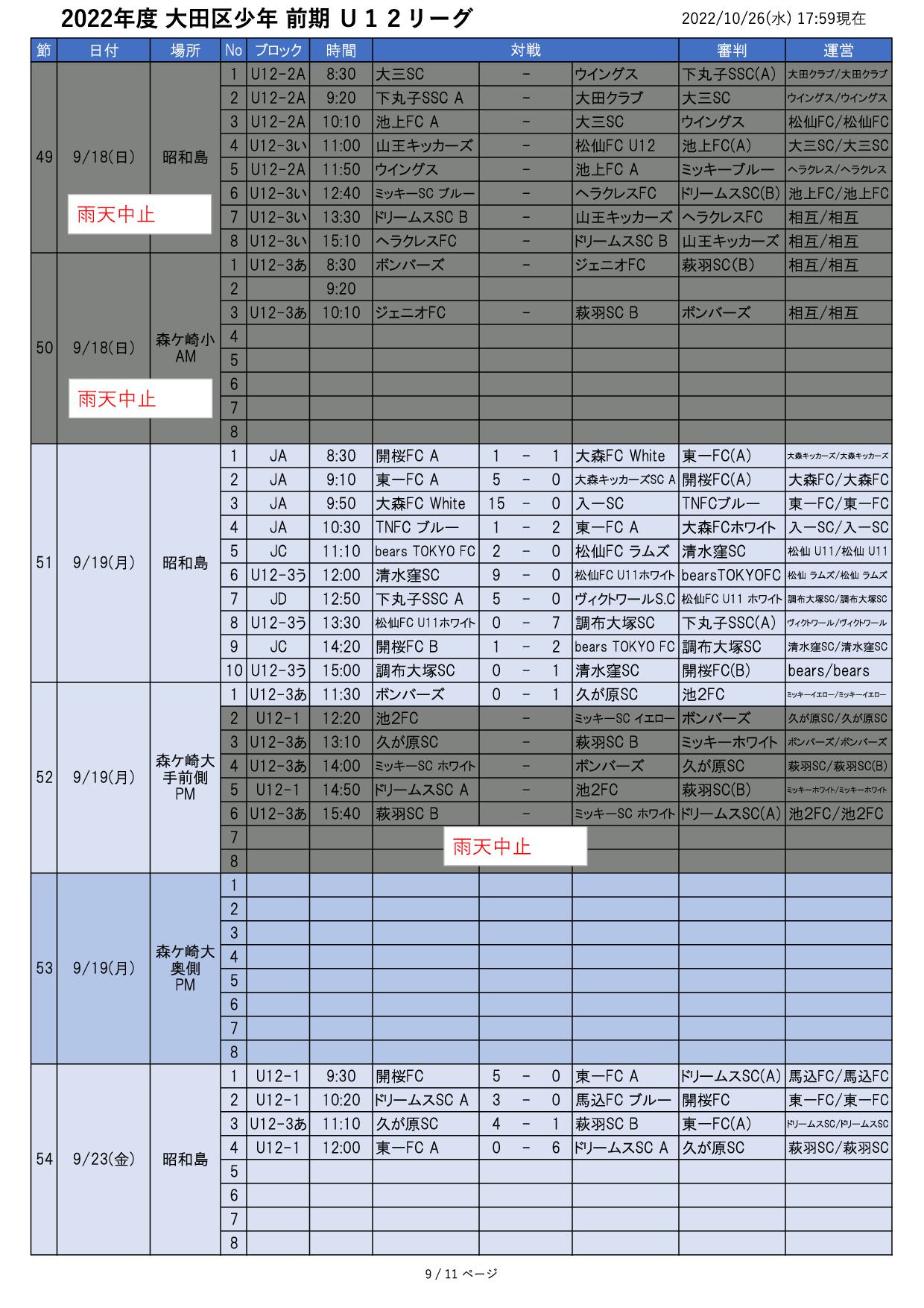 3年 ago By ofa 上へ 組合わせ 大会日程 大会結果 対戦リスト 添付ファイル 過去記録 組合わせ U12リーグ大会日程 【大会日程】 <==こちらから。 添付 サイズ 20221009【U12】昭和島.pdf 119.83 KB 20221010【U12】昭和島.pdf 121.19 KB 前期 U12リーグ大会結果 前期 U12リーグ対戦リスト 添付ファイル 2022年度 前期リーグ 組合わせ 2022年度 前期U12リーグ 星取表 2022年度 前期U12リーグ 対戦リスト ブック横断リンク: 【少年部】2022年度 前期 U12リーグ ‹ 【少年部】2022年度 リーグ戦 上へ 【少年部】2022年度 前期 ジュニアリーグ ›