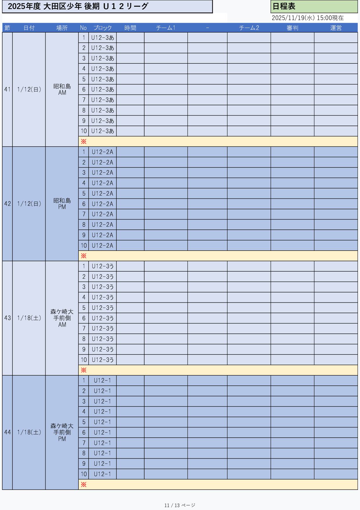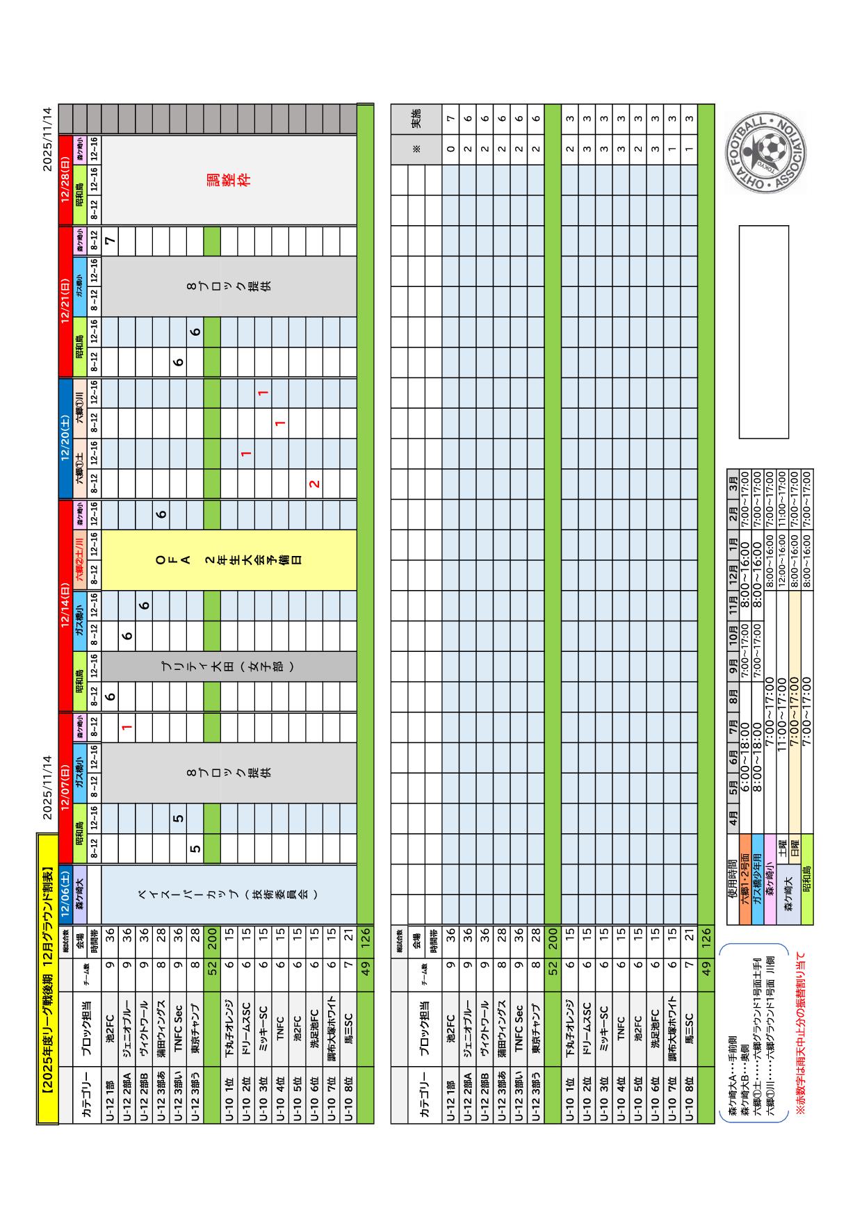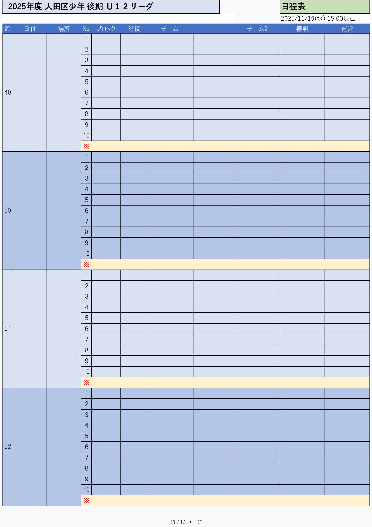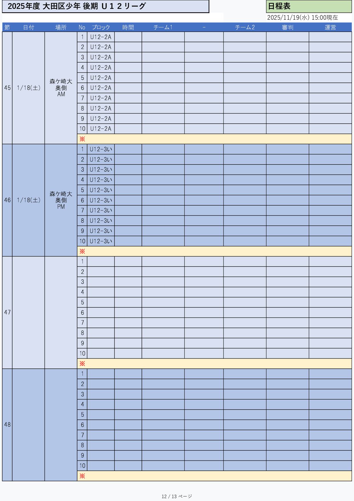 結果日程割当要項/ガイド組合せ添付 結果 a日程 グラウンド割当 組合せ 添付2025年度 少年リーグ 組合わせ2025年度 前期グランド割当11月2025年度 前期グランド割当12月2025年度 前期グランド割当1月2025年度 前期U12リーグ日程2025年度 前期U12リーグ結果 少年部 2025年度 U12リーグ 後期