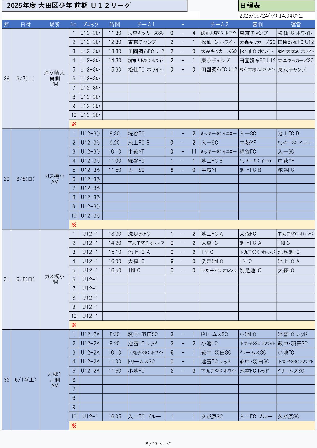 結果日程割当要項/ガイド組合せ添付 結果 日程 グラウンド割当 組合せ 添付2025年度 少年リーグ 組合わせ2025年度 前期グランド割当4月・5月2025年度 前期グランド割当6月2025年度 前期グランド割当9月2025年度 前期U12リーグ日程2025年度 前期U12リーグ結果 少年部 2025年度 U12リーグ 前期
