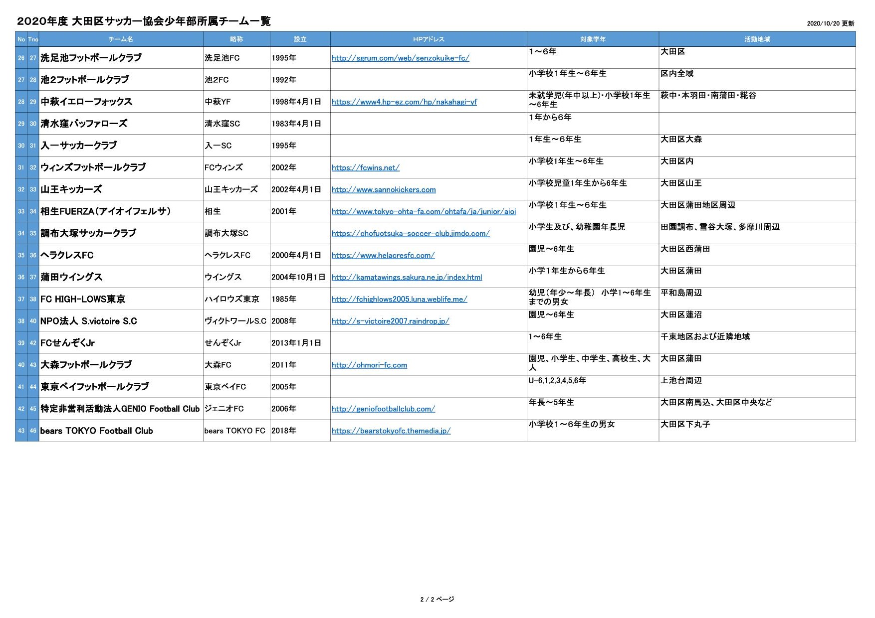 | 1 | ミッキーサッカークラブ | 1985年 | 5歳から小学6年生 | 大田区大森・糀谷地域 | |
