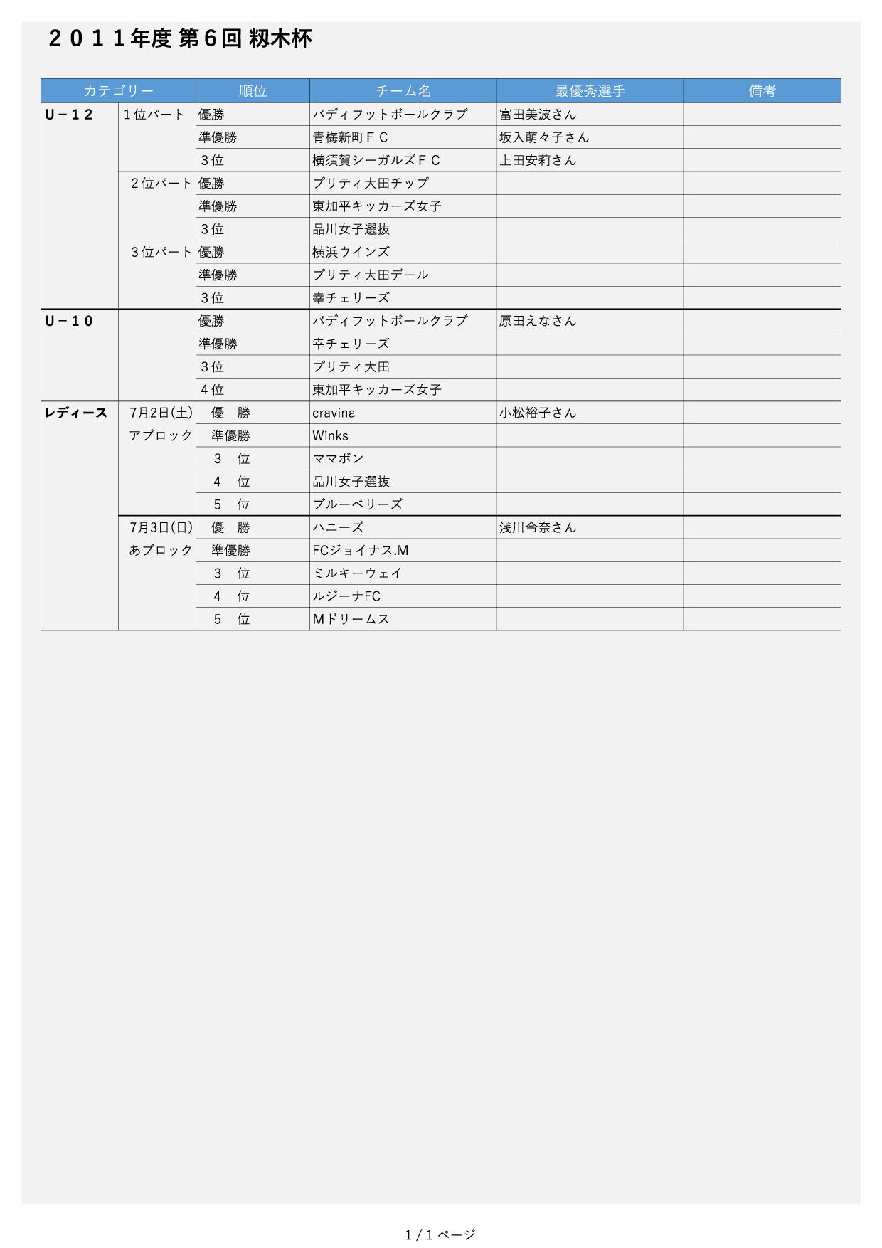 5年 ago By ofa 上へ 大会結果 添付ファイル 過去記録 大会結果 添付ファイル 2011年度 籾木杯 大会結果 ブック横断リンク: 【レディース】2011年度 籾木杯 ‹ 【レディース】2011年度 mumフットサル大会 上へ 【レディース】2010年度 ›