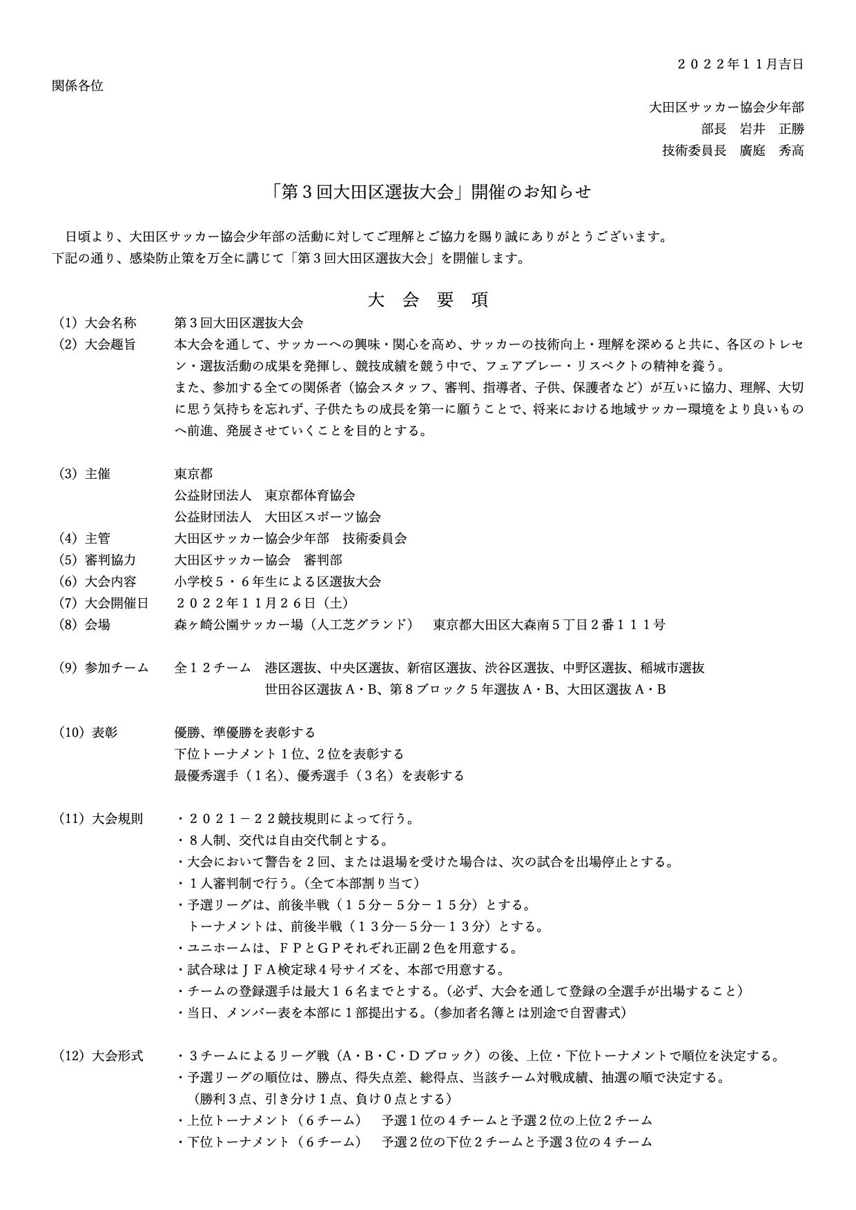 2年 ago By ofa 上へ 年度 2022年度 カテゴリ 少年部 添付 第3回大田区選抜大会要項.pdf ブック横断リンク: 【技術委員会】11/26「第3回大田区選抜大会」開催のお知らせ ‹ 【技術委員会】11/26「第3回大田区選抜大会」開催レポート 上へ 【技術委員会】7/31「品川区 U12選抜招待大会」出場辞退のお知らせ ›
