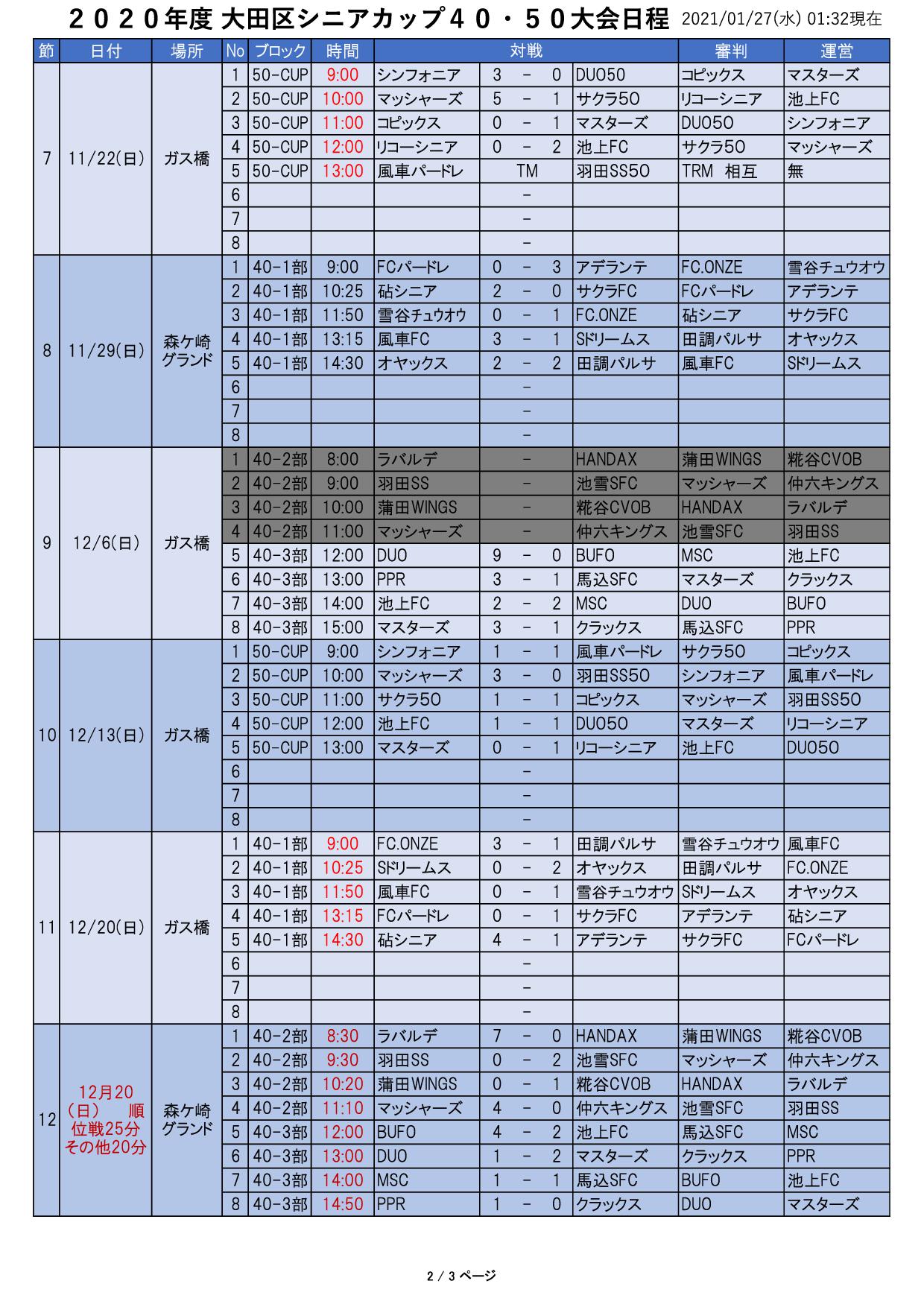 5年 ago By ofa 上へ 大会要綱 トーナメント表 大会日程 添付ファイル 過去記録 大会要綱 大会トーナメント表 大会日程 添付ファイル 2020年度 シニアカップ大会要綱 2020年度 シニアカップ(O401部)トーナメント表 2020年度 シニアカップ日程 結果報告書 事故報告書 ブック横断リンク: 【シニア部】2020年度 シニアカップ(O40 1部) ‹ 【シニア部】2020年度 加盟チーム 上へ 【シニア部】2020年度 シニアカップ(O40 2部3部) ›