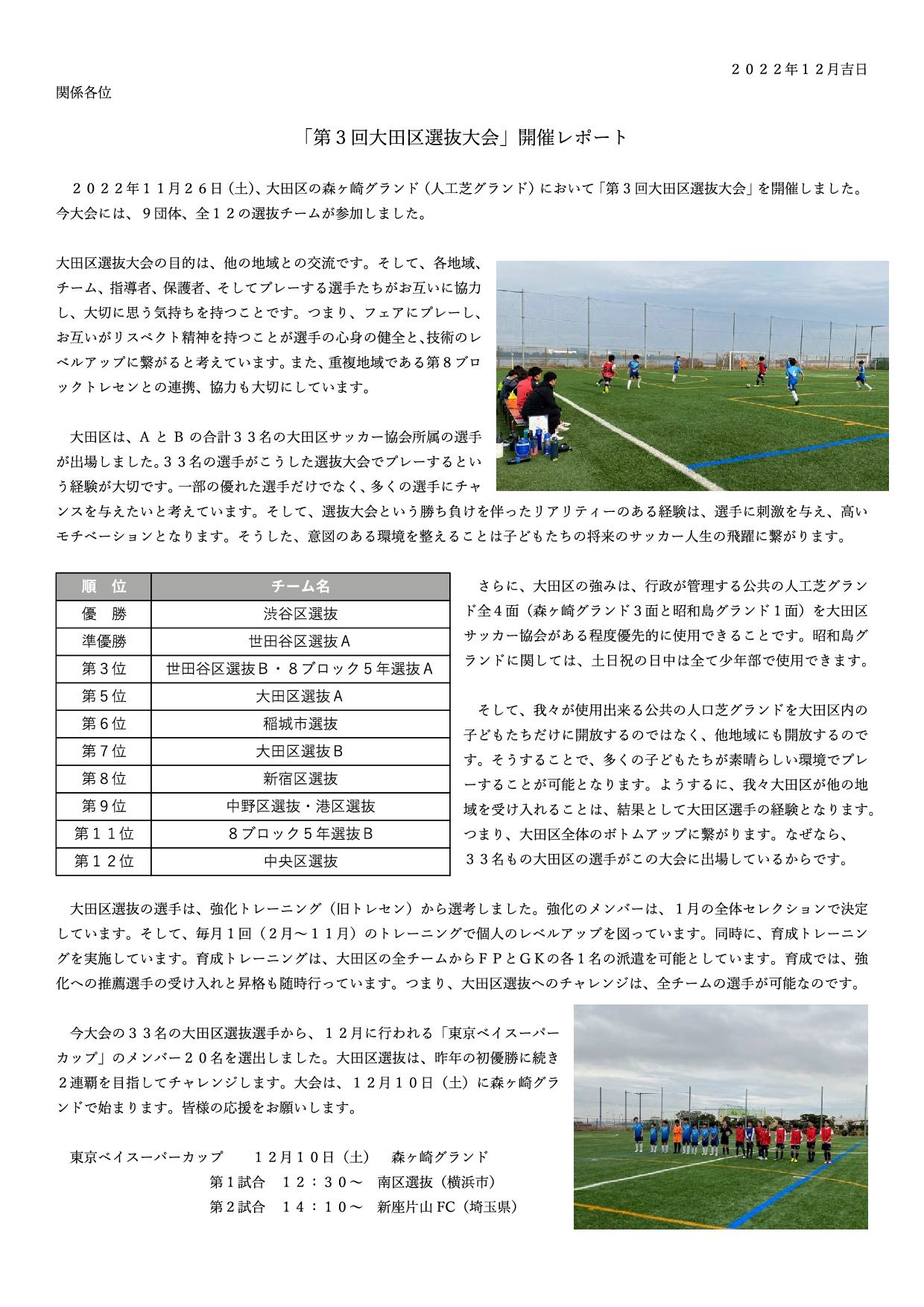 2年 ago By ofa 上へ 年度 2022年度 カテゴリ 少年部 添付 第3回大田区選抜大会レポート.pdf ブック横断リンク: 【技術委員会】11/26「第3回大田区選抜大会」開催レポート ‹ 【技術委員会】東京ベイスーパーカップ結果報告 上へ 【技術委員会】11/26「第3回大田区選抜大会」開催のお知らせ ›